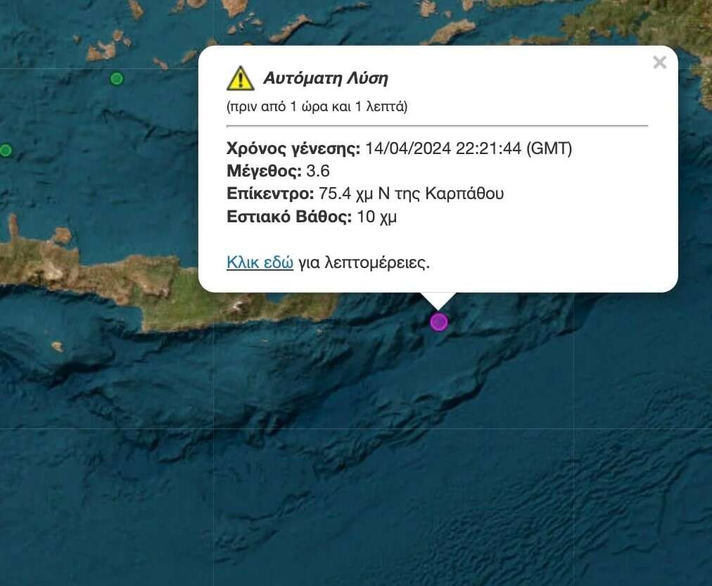 Η αυτόματη λύση του Γεωδυναμικού Ινστιτούτου του Αστεροσκοπείου Αθηνών έδωσε το σεισμό στα 3,6 Ρίχτερ, με εστιακό βάθος τα 13,6 χλμ, και επίκεντρο 37 χλμ., νότια – νοτιοανατολικά της Κάσου.