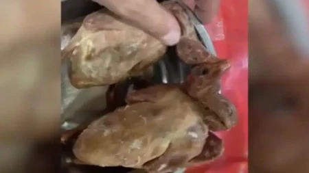 Βίντεο που τραβήχτηκαν από την Αστυνομία μέσα στο εστιατόριο δείχνουν κομμάτια κρέας να κρέμονται από απλώστρα για ρούχα, σε μια αποκρουστική εικόνα.