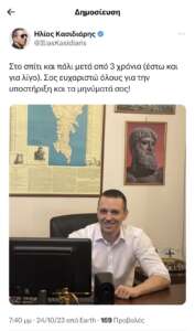 Media«Στο σπίτι και πάλι μετά από 3 χρόνια»: Η ανάρτηση του Ηλία Κασιδιάρη μετά την πενθήμερη άδεια