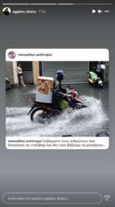 Αυτή τη φορά λοιπόν, με αφορμή τις μεγάλες πλημμύρες που προήλθαν από την κακοκαιρία «Μπάλλος», ο Άγγελος Λάτσιος αναδημοσίευσε μία ανάρτηση η οποία ξεκαθαρίζει ότι αυτές τις μέρες, καλό θα ήταν να μην παραγγέλνουμε ντελίβερι, ώστε να μην ταλαιπωρούμε τους ντελιβεράδες στους πλημμυρισμένους δρόμους.
