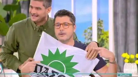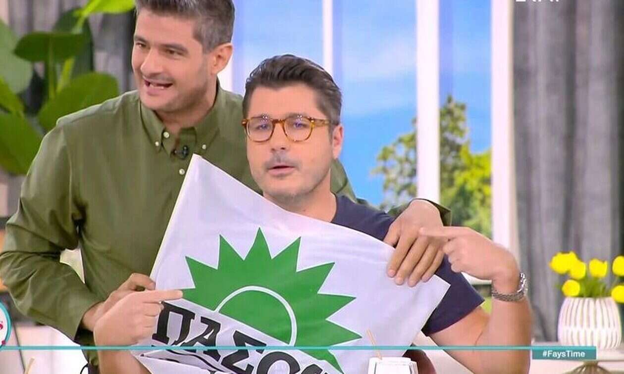 Έτσι, με χιουμοριστική διάθεση ο Άγγελος Βουράκης έφερε στο πλατό της εκπομπής «Fay’s Time» τη σημαία του ΠΑΣΟΚ, με την οποία και «τύλιξε» σχεδόν τον Άγγελο Κωνσταντάρα.