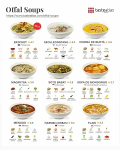 Στην πρώτη βρίσκεται η φιλιππινέζικη «Batchoy», μια σούπα με νουντλς, με χοιρινές μπουκιές, ζωμό κότας και μοσχαρίσιο φιλέτο. Στην δεύτερη θέση βρίσκεται η τουρκική «Kelle paça çorbası» με κομμάτια προβάτου ή κατσικιού, κρεμμύδια και αλάτι.