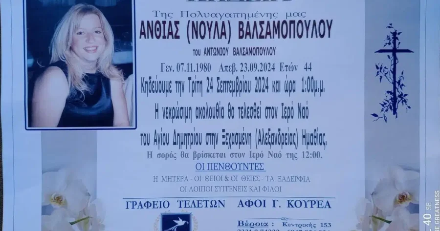 Έφυγε από την ζωή σε ηλικία μόλις 44 ετών η Ανθία (Νούλα) Βαλσαμοπούλου. Η κηδεία της θα πραγματοποιηθεί την Τρίτη 23 Σεπτεμβρίου 2024 και ώρα 1.00 μ.μ. στον Ιερό Ναό του Αγίου Δημητρίου στην Ξεχασμένη Ημαθίας.