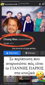 Το όνομα που χρησιμοποίησαν είναι Chung Woo και στην παρένθεση γράφει Yiannis Parios. Με χιουμοριστική διάθεση, ο Χάρης Βαρθακούρης έγραψε στην ανάρτησή του: «Σε περίπτωση που αναρωτιέστε πως είναι το Γιάννης Πάριος στα κινέζικα».