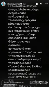 Ο Νίκος Μουτσινάς έγραψε ένα μακροσκελές κείμενο στα Instagram Stories του, ενημερώνοντας τους διαδικτυακούς του φίλους για την απάτη και τονίζοντας πως θα προβεί σε κάθε νόμιμη ενέργεια.