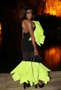 Φορώντας μια εντυπωσιακή δημιουργία του σχεδιαστή σε μαύρο χρώμα με διαφάνεια συνδυασμένο με κίτρινα neon στοιχεία, η Ελίζαμπεθ Ελέτσι παρακολούθησε το catwalk με φόντο τη φωτισμένη λίμνη της Βουλιαγμένης.