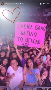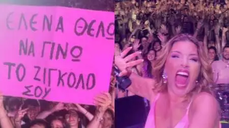 Ωστόσο υπήρξε ένας που της τράβηξε την προσοχή, καθώς το ροζ χαρτόνι που κρατούσε έγραφε… «Έλενα θέλω να γίνω το ζιγκολό σου», κάνοντας αναφορά σε ένα από τα πιο γνωστά τραγούδια της.
