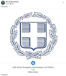 Συγκεκριμένα ανανέωσε την σελίδα του στο Facebook λίγη ώρα μετά την επίσημη κυβερνητική ανακοίνωση περί παραίτησης και στο εργασιακό status ενημέρωσε ότι «Σταμάτησε να εργάζεται για Υπουργείο Προστασίας του Πολίτη».