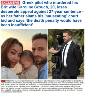 Ο πατέρας της Καρολάιν, που δολοφονήθηκε από τον σύζυγό της Μπάμπη Αναγνωστόπουλο, στη μεζονέτα τους, στα Γλυκά Νερά, το 2021, μιλώντας στην Daily Mail, υπογράμμισε ότι «ούτε η θανατική ποινή θα ήταν επαρκής».