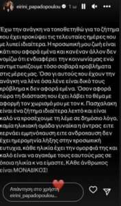 Όσον αφορά τώρα τη διάσταση που έχει πάρει το θέμα με αφορμή τον χωρισμό μου από τον κύριο Πασχαλάκη είναι ένα ζήτημα ιδιαίτερα λεπτό και είναι καλό να προσέχουμε τι λέμε σε δημόσιο λόγο. Καμιά ηλικιακή ομάδα, γυναίκα ή άνδρας είτε περνάει εμμηνόπαυση είτε ανδρόπαυση δεν έχει ημερομηνία λήξης στην προσωπική ευτυχία, κάθε ηλικία έχει την ομορφιά της και καλό είναι να αγαπάμε τους εαυτούς μας σε όποια ηλικία και να είμαστε. Κάθε άνθρωπος είναι μοναδικός», έγραψε η Ειρήνη Παπαδοπούλου στην ανάρτησή της στο Instagram, το βράδυ της Πέμπτης.