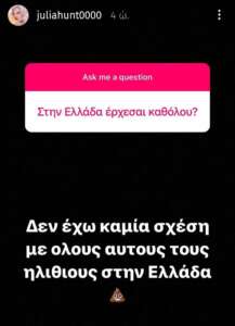 Στο πλαίσιο ενός Q&A που έκανε στον προσωπικό της λογαριασμό στο Instagram, η Τζούλια Αλεξανδράτου απάντησε και σε έναν ακόλουθό της, ο οποίος την ρώτησε αν έρχεται καθόλου στην Ελλάδα.
