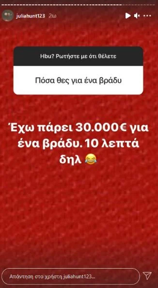 Η ίδια, αφήνει να εννοηθεί πως είναι πολύ άνετα οικονομικά, με το τελευταίο βίvτεο που ανήρτησε στα social media της ως Julia Hunt να την απεικονίζει μέσα σε μία Ferrari και λίγο αργότερα να επιδεικνύει… 50ευρα αλλά και χαρτονομίσματα των 500 ευρώ.