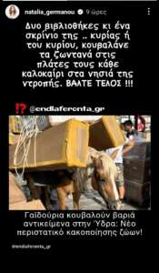 Ανάρτηση – ξέσπασμα και από τη Ναταλία Γερμανού η οποία έγραψε στο instagram: «Δύο βιβλιοθήκες και ένα σκρίνιο της κυρίας ή του κυρίου κουβαλάνε τα ζωντανά στις πλάτες τους κάθε καλοκαίρι στα νησιά της ντροπής βάλτε τέλος», έγραψε στο instagram η παρουσιάστρια του Alpha.
