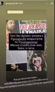 «Γιατί δεν βρίσκει γυναίκα ο Γεωργίου αναρωτιέται το δημοσίευμα. Μήπως επειδή είναι γκέι; Εσείς τι λέτε;» έγραφε η ανάρτηση. Ο Αντρέας Γεωργίου αναδημοσίευσε στο δικό του λογαριασμό στο Instagram το εν λόγω story και έγραψε: «Και με κάνει και ταγκ… Δηλαδή σήμερα καίγεται η Ελλάδα και ο δημοσιογράφος αυτός αναρωτιέται αν είμαι γκέι».