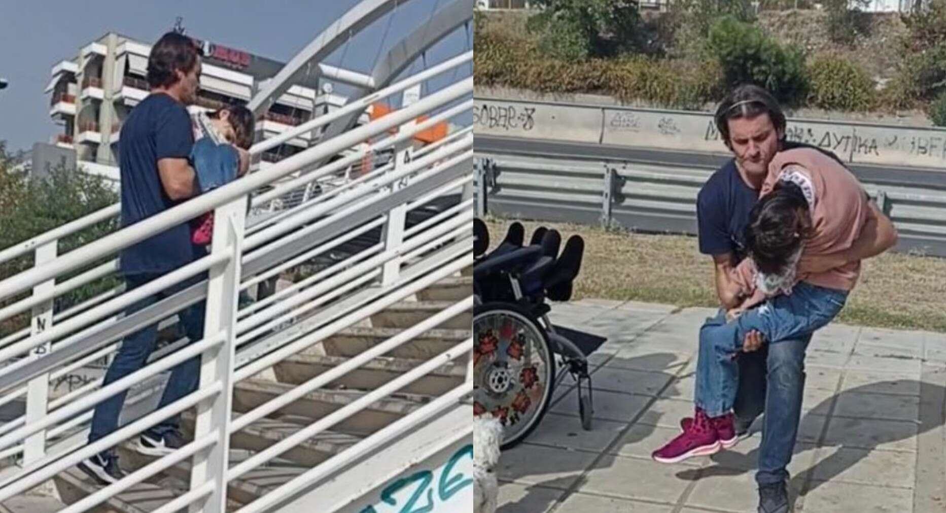 Το αναπηρικό αμαξίδιο ήταν αδύνατο να ανεβεί τα πολλαπλά σκαλοπάτια της γέφυρας, ακόμα και με τη βοήθεια συνοδού, οπότε ο πατέρας χρειάστηκε να κουβαλήσει στην αγκαλιά του το παιδί του. Σαν να μην έφτανε αυτό, χρειάστηκε ακόμα ένα άτομο προκειμένου να ανεβάσει το αμαξίδιο μέχρι τον διάδρομο της γέφυρας.