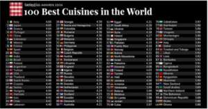 Με «Άριστα» το 5, η ελληνική κουζίνα συγκέντρωσε βαθμολογία 4,64 και αναδείχθηκε δεύτερη καλύτερη παγκοσμίως. Την πρώτη θέση μοιράστηκαν η Ιταλία και η Ιαπωνία με βαθμολογία 4,65. Την πρώτη πεντάδα συμπλήρωσαν η Πορτογαλία με 4,61 και η Κίνα με 4,59. Η μεσογειακή και η ασιατική κουζίνα εξακολουθούν και αυτό τον χρόνο να είναι οι αγαπημένες του κοινού.