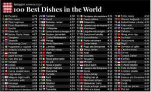 Η πίτσα βρίσκεται στην 4η θέση, το διάσημο ισλί κεμπάπ στην 37η θέση και τα μακαρονάδα με κιμά στην 68η θέση.