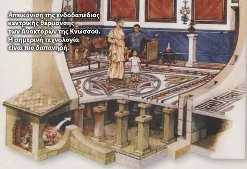 Την πανάρχαια πόλη ξέθαψε στα 1900 ο Εβανς κι αυτό σημαίνει ότι δεν ήξερε τις εκεί επιδόσεις ο Σουηδός Μ. Τρίβαλντ, που το 1716 λάνσαρε την ενδοδαπέδια θέρμανση, σε μορφή περίπου όπως είναι σήμερα. Ούτε οι πλούσιοι Ρωμαίοι γνώριζαν την ενδοδαπέδια θέρμανση. Αυτοί χρησιμοποιούσαν το «υπόκαυστον»: