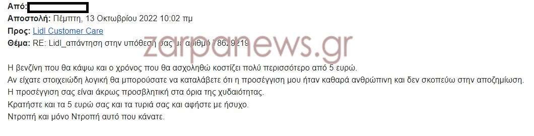 «Η βενζίνη που θα κάψω και ο χρόνος που θα ασχοληθώ κοστίζει πολύ περισσότερο από πέντε ευρώ. Αν είχατε στοιχειώδη λογική, θα μπορούσατε να καταλάβετε ότι η προσέγγισή μου ήταν καθαρά ανθρώπινη και δεν σκοπεύω στην αποζημίωση. Η προσέγγισή σας είναι άκρως προσβλητική στα όρια της χυδαιότητας. Κρατήστε και τα πέντε ευρώ σας και τα τυριά σας και αφήστε με ήσυχο. Ντρόπη και μόνο ντροπή γι’ αυτό που κάνατε».