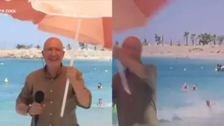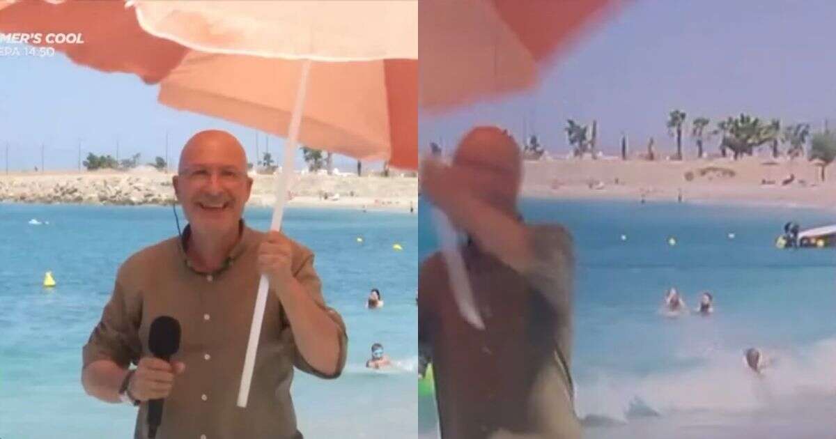 Μια ομπρέλα θαλάσσης που κρατούσε στα χέρια του ο ρεπόρτερ Γιώργος Τσελίκας τον «παρέσυρε» σε ζωντανή σύνδεση