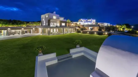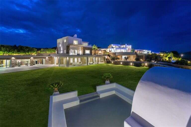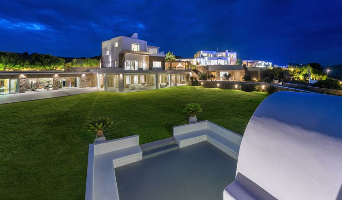 Εκεί, όπου η πανοραμική θέα προς το Αιγαίο κόβει την ανάσα και η σικ πολυτέλεια αποκαλύπτεται σε όλο της το μεγαλείο. Τριάντα άνθρωποι μπορούν να κοιμηθούν στις έξι σουίτες και στα εφτά master bedrooms που υπάρχουν, διακοσμημένα και απόλυτα εναρμονισμένα με την αισθητική των Κυκλάδων.