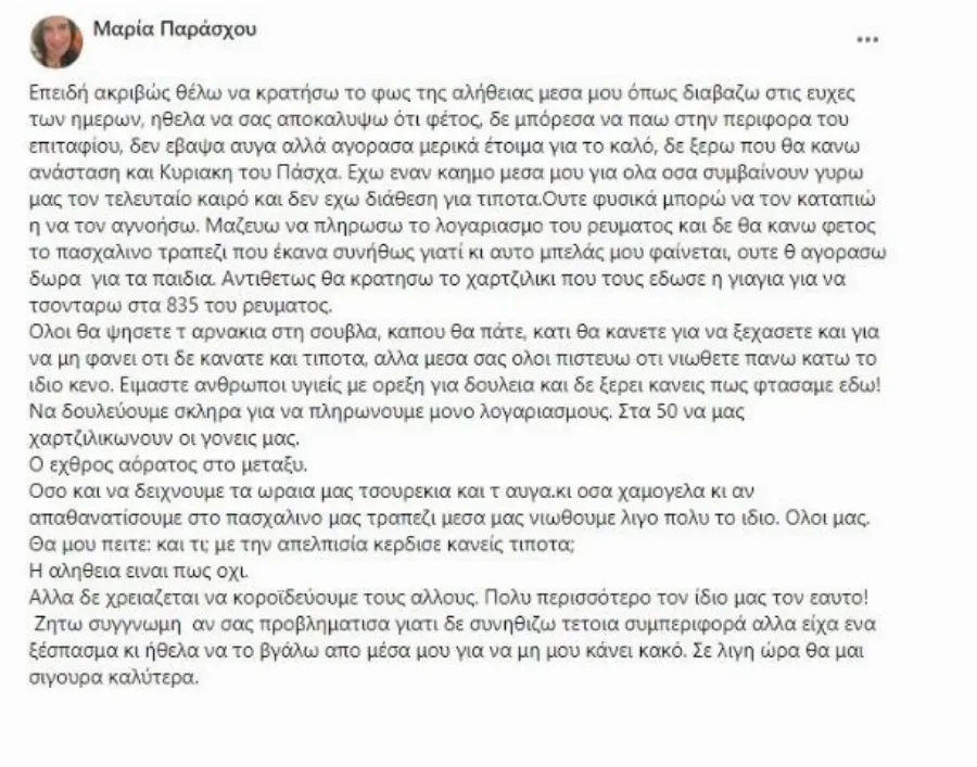 Μια γυναίκα, η Μαρία Παράσχου, μέσω μίας ανάρτησης στον προσωπικό της λογαριασμό στο Facebook μοιράζεται τον δικό της Γολγοθά αυτή την περίοδο της γιορτής του Πάσχα.