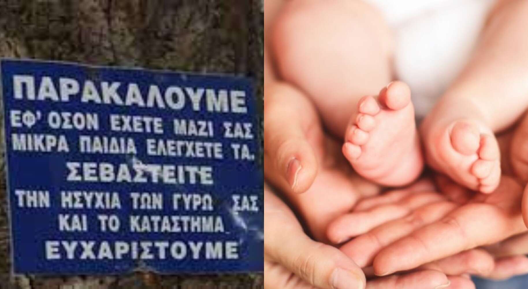 Χωρίς να ισχυρίζεται πως πολλοί γονείς μικρών παιδιών αποφεύγουν να τα περιορίσουν στις οικογενειακές κοινωνικές εξόδους τους, έτσι ώστε να μην ενοχλούν τους γύρω, μια Ελληνίδα μαμά, η οποία τα τελευταία χρόνια ζει μόνιμα στο Λονδίνο, παρατήρησε σε μία ελληνική ταβέρνα κάτι που την ενόχλησε πολύ. Η Φ. Μ., λοιπόν, βρέθηκε τον περασμένο μήνα για διακοπές στην Ελλάδα με τον σύζυγο και τα δύο μικρά παιδιά της, και κατά την επίσκεψή της σε οικογενειακή επιχείρηση εστίασης “έπεσε πάνω” σε αυτή την ταμπέλα που την έκανε να θυμώσει και να γράψει το παρακάτω, με το οποίο πιστεύουμε, ότι πολλοί θα συμφωνήσετε: