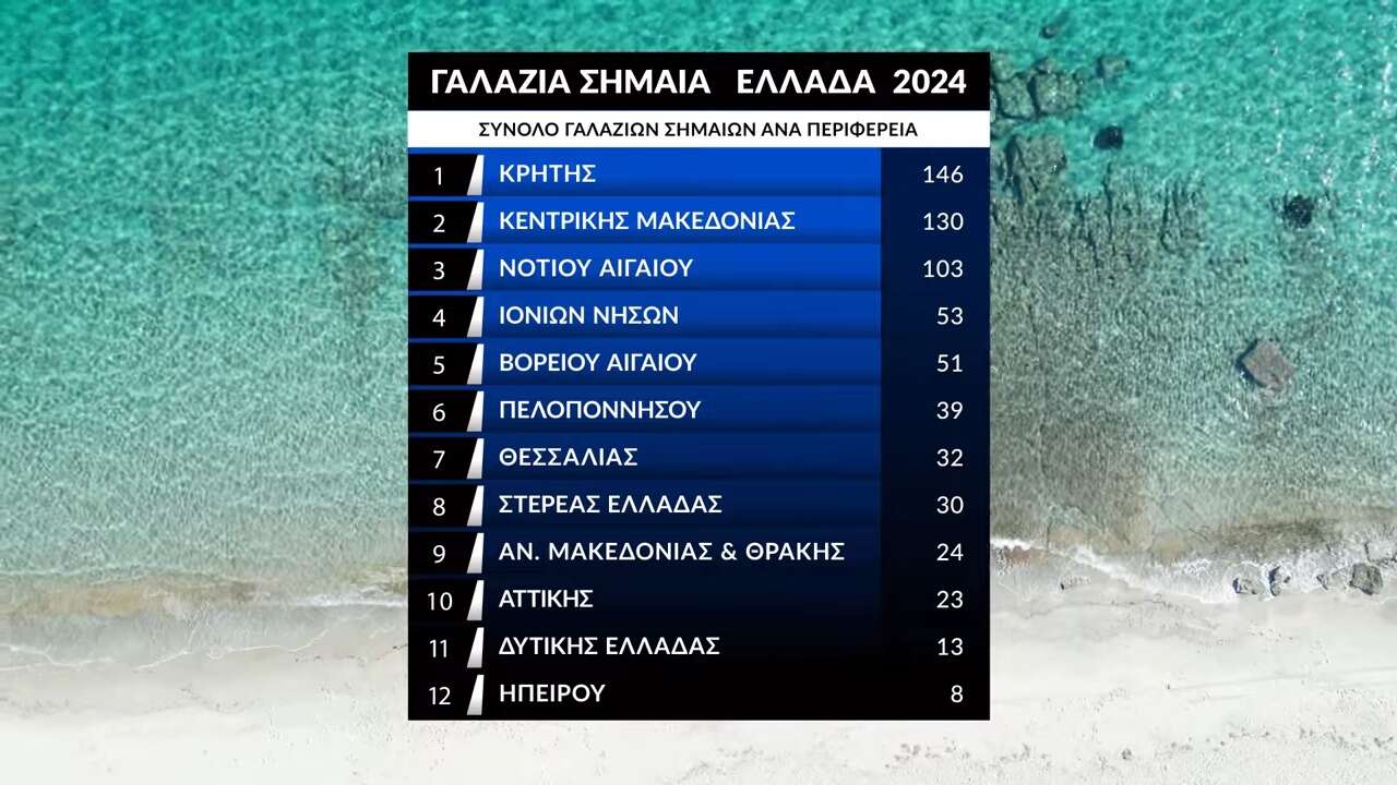Σε εθνικό επίπεδο, η Περιφέρεια Κρήτης διατηρεί τα κεκτημένα της στην πρώτη θέση με 146 βραβευμένες ακτές, ενώ ο νομός Χαλκιδικής αναδεικνύεται πρωταθλητής με 104 γαλάζιες σημαίες.