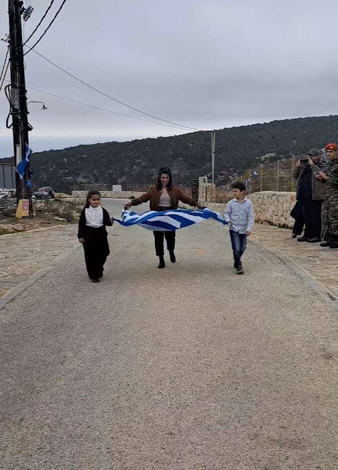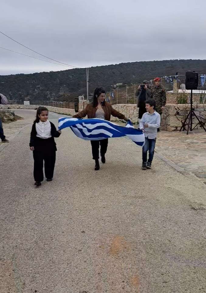 Οι δυο μαθητές παρέλασαν κρατώντας την Ελληνική σημαία μαζί με την δασκάλα τους και γέμισαν χαμόγελα τους γονείς και τους άλλους κατοίκους του ακριτικού νησιού.