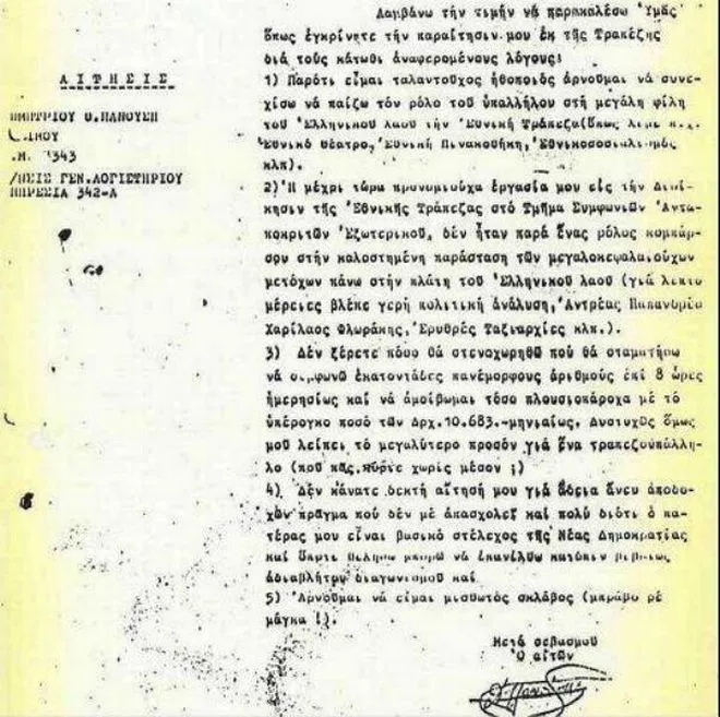 StoriesΗ επιστολή παραίτησης του Πανούση από την Εθνική Τράπεζα – Έπαιρνε 10.683 δρχ το μήνα