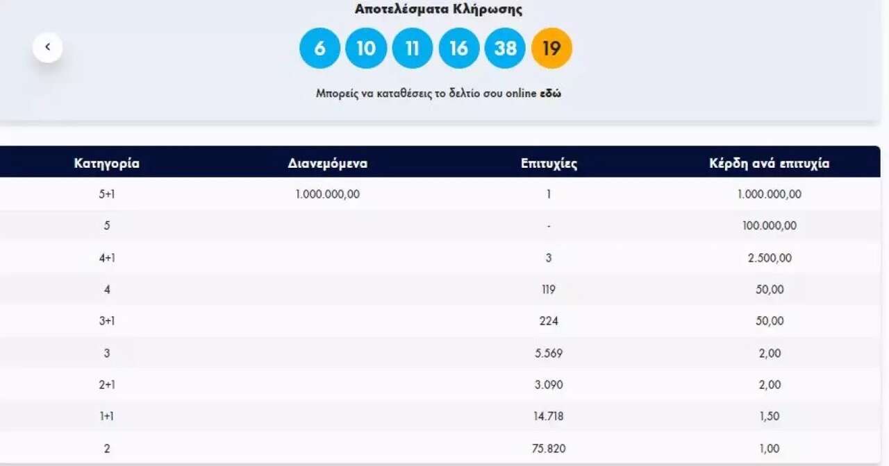 Οι τυχεροί αριθμοί που κληρώθηκαν ήταν: 6, 10, 11, 16, 38 με τζόκερ τον αριθμό 19.