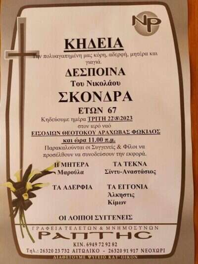 Στη Αράχωβα το “τελευταίο αντίο” στην αδικοχαμένη Δέσποινα Σκόνδρα