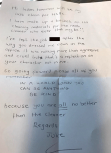 Και ολοκλήρωσε την επιστολή με κάτι θετικό: «Σας παρακαλώ να θυμάστε ότι σε έναν κόσμο που μπορείτε να είστε οτιδήποτε να επιλέγετε να είστε καλοί γιατί δεν είστε καλύτεροι από μια καθαρίστρια. Με εκτίμηση Julie.»