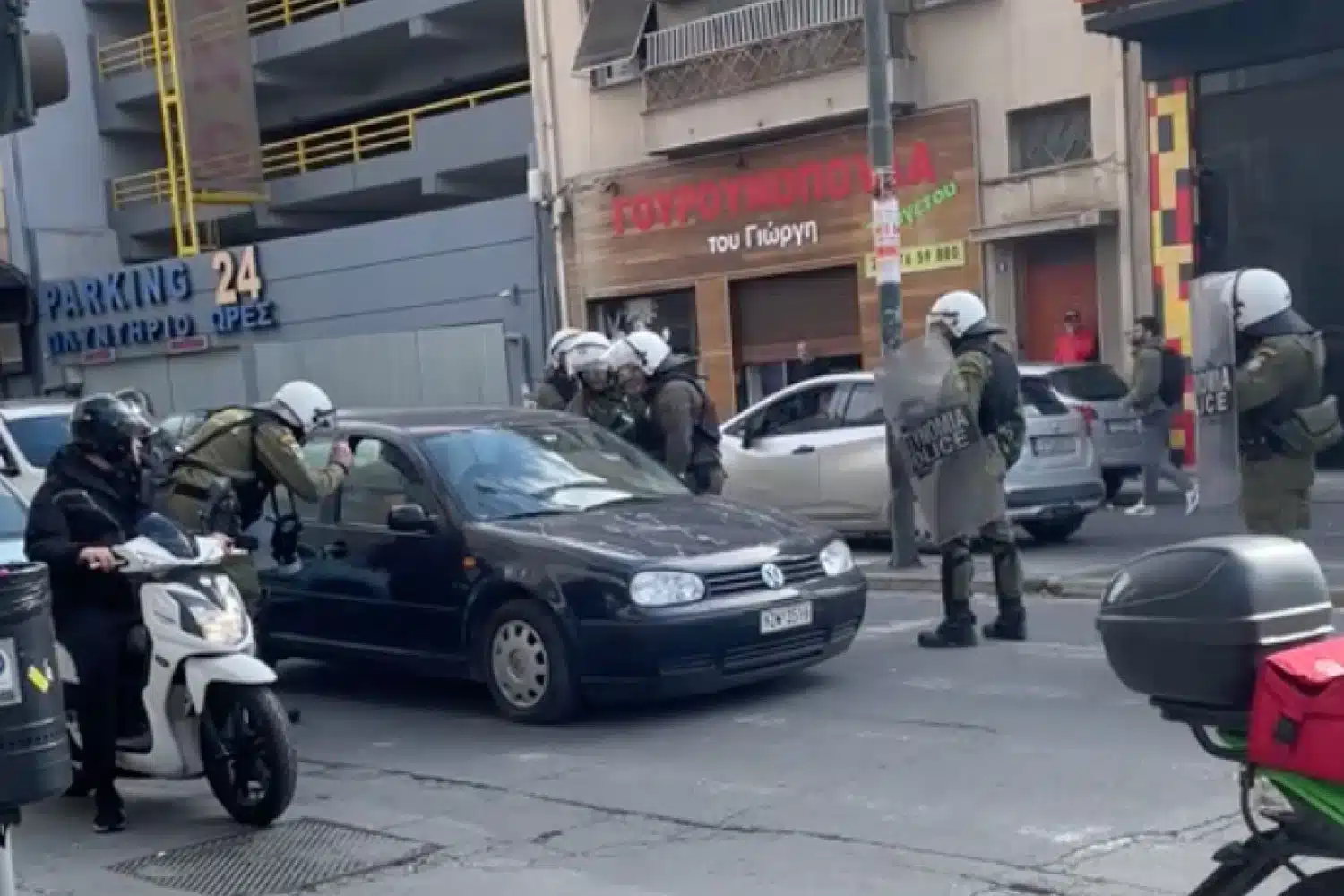 Μάλιστα το αυτοκίνητου του πολίτη το έχει «κυκλώσει» ολόκληρη ομάδα ανδρών των ΜΑΤ και του ζητούν να το πάει στην άκρη και να κατέβει. Οι άλλοι οδηγοί δεν φεύγουν και παρακολουθούν άναυδοι το τι συμβαίνει.