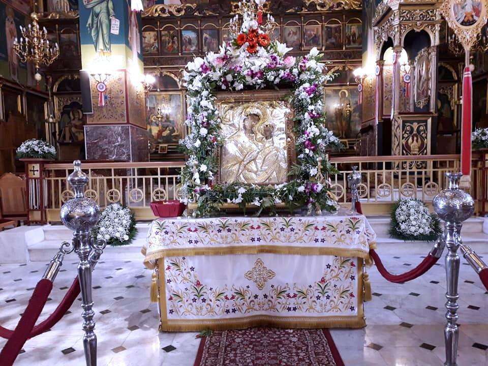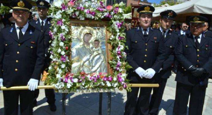 Τα καταστήματα είναι κλειστά και οι δρόμοι στολισμένοι με σημαίες και θυρεούς. Μετά τη Θεία Λειτουργία , γίνεται Λιτάνευση της θαυματουργής Εικόνας , με τη συμμετοχή του κλήρου της Ιεράς Μητροπόλεως και άλλων προσκεκλημένων Επισκόπων, εκπροσώπων της Κυβερνήσεως , Στρατιωτικών αγημάτων , Φιλαρμονικών, επισήμων του τόπου και χιλιάδων λαού που συρρέει από όλα τα μέρη της Ελλάδος.