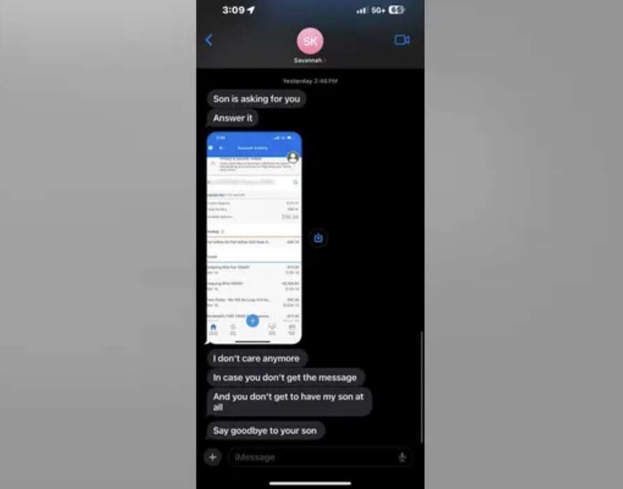 Στη συνέχεια πήρε τον γιο της από τον παιδικό σταθμό και άρχισε να στέλνει μηνύματα στον πρώην σύζυγό της. «Δεν έχεις τίποτα για να πας σπίτι σου τώρα. Πραγματικά δεν έχεις. Δεν θα έχεις τίποτα στο τέλος της ημέρας».