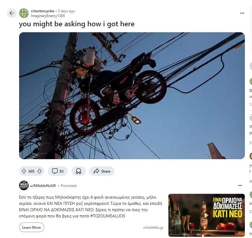 Το θέαμα μιας μοτοσικλέτας να βρίσκεται μπλεγμένη στα καλώδια υψηλής τάσης ρεύματος που ενώνονται με τις γνωστές τσιμεντένιες κολόνες σίγουρα δεν είναι κάτι που συναντάς κάθε μέρα.