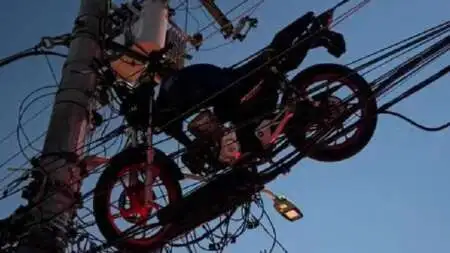 Το θέαμα μιας μοτοσικλέτας να βρίσκεται μπλεγμένη στα καλώδια υψηλής τάσης ρεύματος που ενώνονται με τις γνωστές τσιμεντένιες κολόνες σίγουρα δεν είναι κάτι που συναντάς κάθε μέρα.