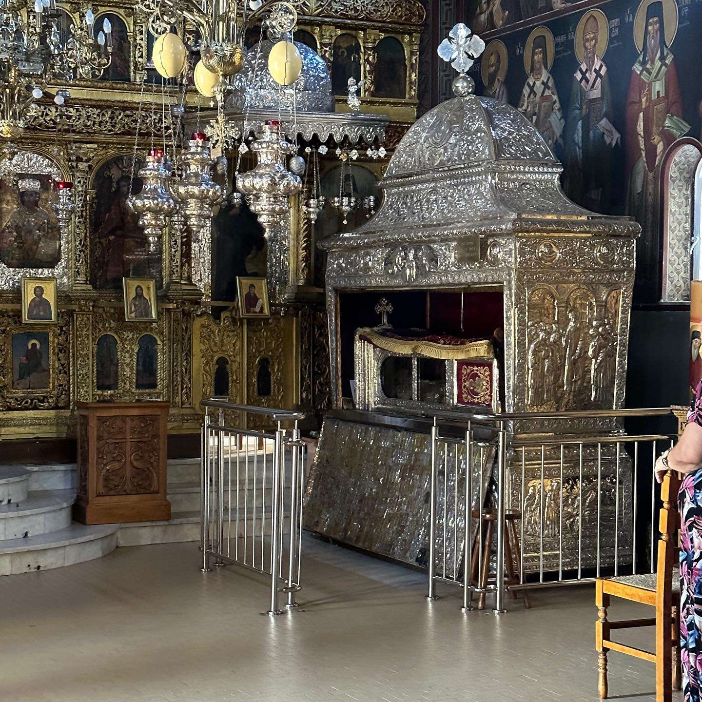 Το σκήνωμα του Αγίου είναι ενδεδυμένο με τα άμφια της ταφής. Είναι τοποθετημένο μέσα σε ασημένια λάρνακα, πάνω από τον τάφο του.