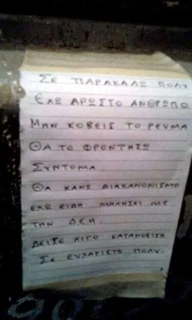 Συγκεκριμένα, το σημείωμα άφησε ο κάτοικος στο ρολόι της ΔΕΗ, προκειμένου να το δει ο εργαζόμενος που είχε πάει να το αποσυνδέσει και να μην προχωρήσει στην πράξη αυτή.