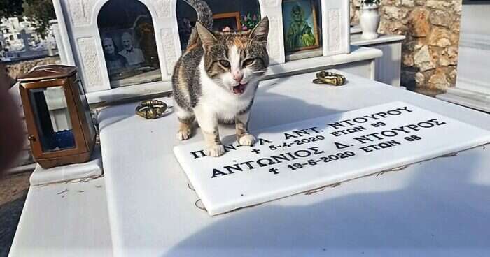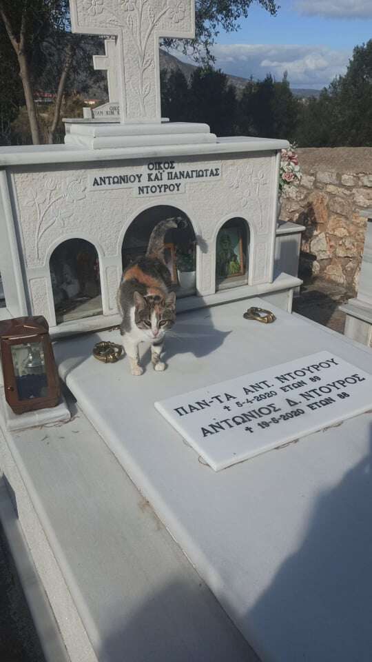 Έτσι, η γάτα δεν βρέθηκε κανένας να το πάρει και έμεινε μόνο. Και για κάποιο χρονικό διάστημα εξαφανίστηκε. Κάποια στιγμή όμως οι άνθρωποι του νεκροταφείου με μεγάλη έκπληξη το είδαν να κάθεται πάνω στο μνήμα τους. Και το αναγνώρισαν. Είχε εγκατασταθεί στο νεκροταφείο όπου πλέον ζει μόνιμα.