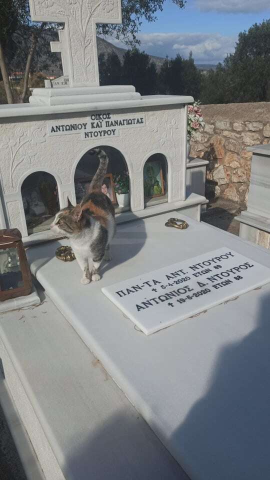 Για αυτό το “γατάκι του κυρ Αντώνη” μίλησε στην τηλεόραση του ΣΚΑΙ ο ιερέας της κωμόπολης π. Σταύρος Δελημανώλης. Σύμφωνα με τον ιερέα η γάτα το είχαν υιοθετήσει δύο ηλικιωμένοι Ο “κυρ Αντώνης” και η “κυρα Γιώτα” Ντούρου, οι οποίοι δυστυχώς πέθαναν την Άνοιξη του 2020, με διαφορά ενός μήνα μεταξύ τους. Μάλλον ο ένας δεν άντεξε τον χωρισμό από τον άλλον και ήθελε να τον βρει. Η αγάπη αυτή είναι συγκινητική.