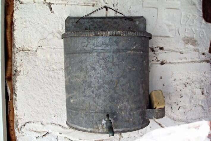 Σπάνια μεταλλική κατασκευή, ξεχωριστή θέση για σαπούνι στο πλάι. Στην άκρη, την σιδερένια «απόληξη», ένα βρυσάκι το οποίο χρησιμοποιούσες για να πλύνεις το πρόσωπό σου, ενίοτε τα πιάτα ή τα ποτήρια και στο τσακίρ κέφι έκανες κι ένα μπάνιο.