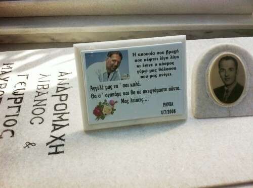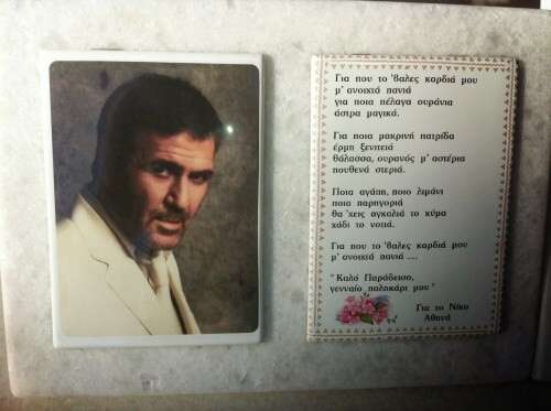 Στο κοιμητήριο στη Δράμα, ιδιαίτερη πατρίδα του, όπου βρίσκεται η τελευταία κατοικία του, οι αφιερώσεις από ανθρώπους που τον θαύμαζαν και τον αγάπησαν δεν έχουν τελειωμό. Μία όμως από αυτές είναι πραγματικά συγκλονιστική και πολύ συγκινητική.