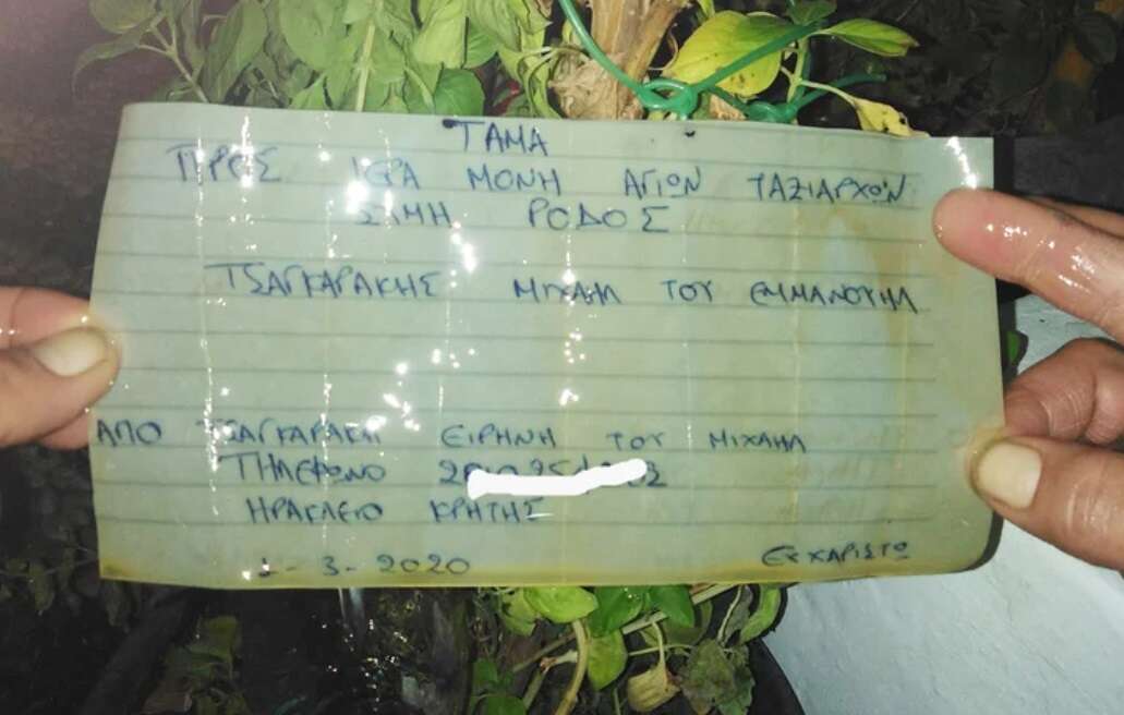 Η ημερομηνία στο μπουκαλάκι αναγράφει 1η Μαρτίου 2020, και, παρά την πολυετή του διαδρομή, το τάμα έφτασε, επιτέλους, στον Πανορμίτη από το Ηράκλειο της Κρήτης.