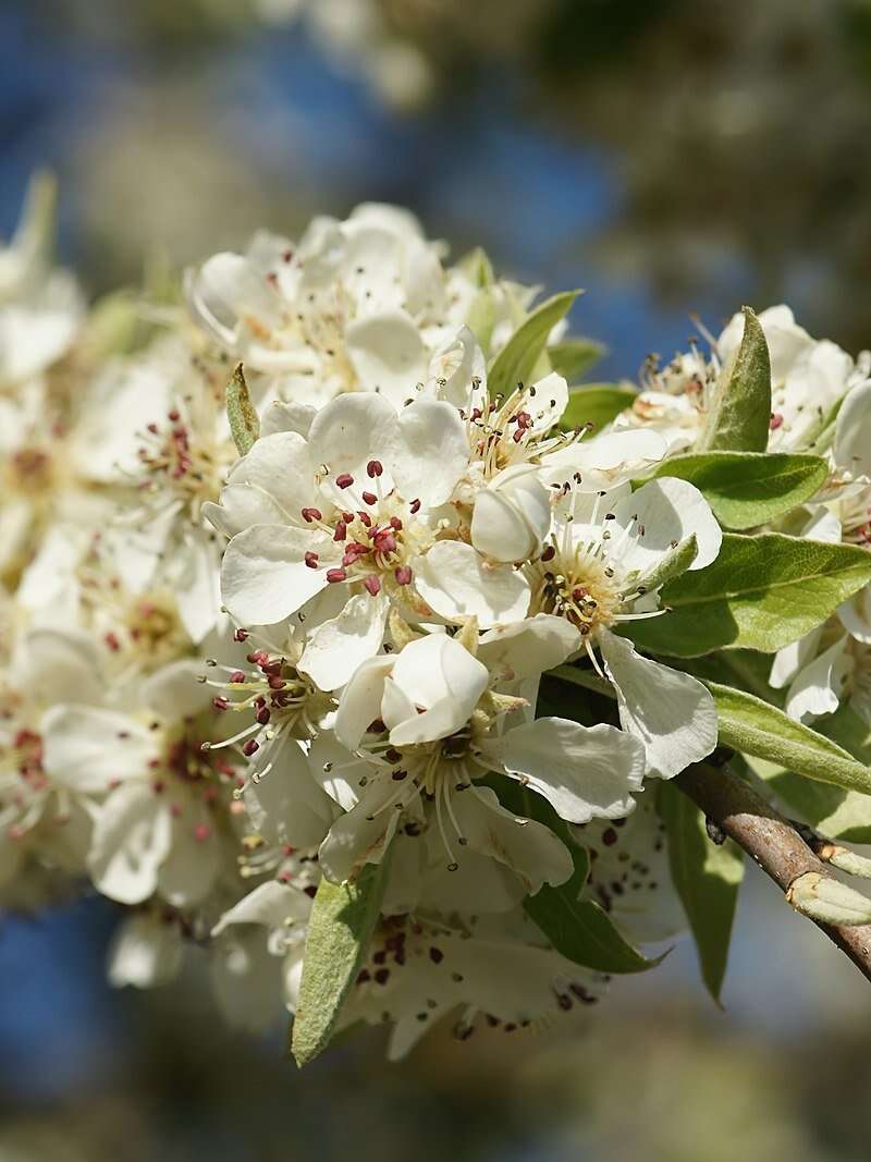 Τα άνθη της βγαίνουν σαν μπουκετάκια σε ταξιανθία σκιαδιόμορφο κόρυμβο. Αποτελούνται από πέντε άσπρα πέταλα. Ανθίζει την Άνοιξη (Απρίλιος – Μάιος).