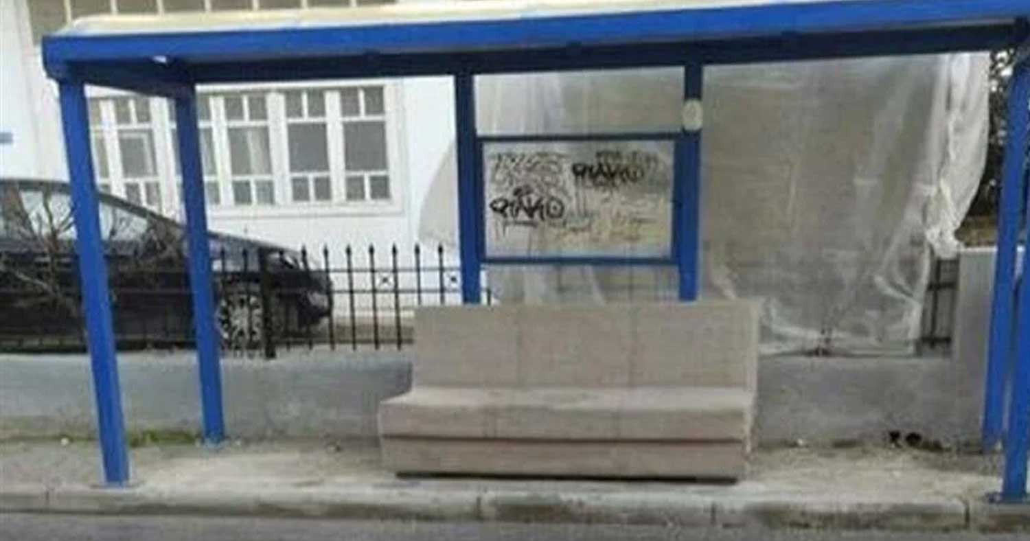 Όπως αναφέρει η ΕΡΤ, αντί για το κλασικό παγκάκι, στο οποίο κάθονται οι πολίτες εν αναμονή του λεωφορείου, είδαν έναν… καναπέ.