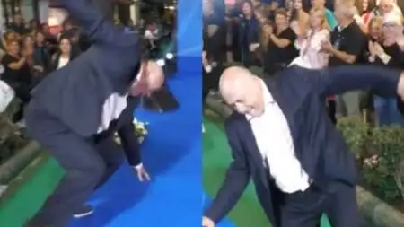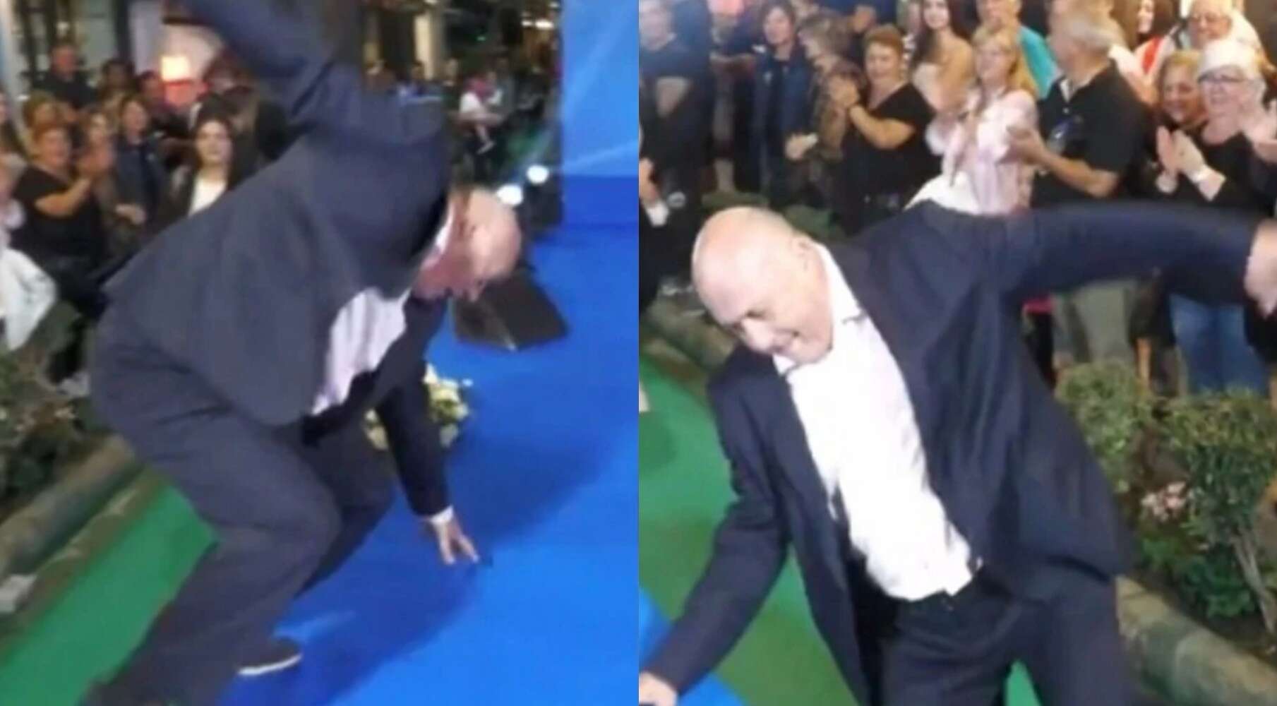 Κατά την προσπάθειά του να ανέβει στη σκηνή, η οποία ήταν υπερυψωμένη, έχασε την ισορροπία του και βρέθηκε στο έδαφος.