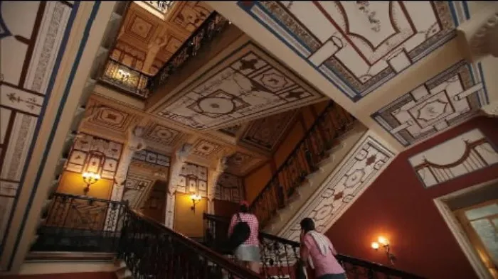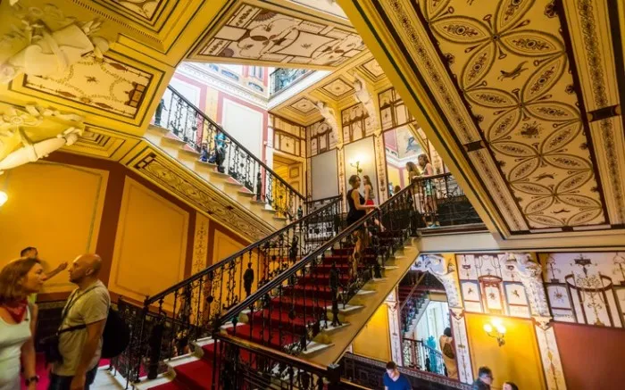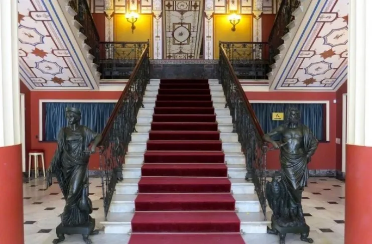 Καθώς μπαίνεις στο ανάκτορο αντικρίζεις το κλιμακοστάσιο, ανεκτίμητο έργο τέχνης, το οποίο υμνεί την ελληνική μυθολογία με αγάλματα του Δία και της Ήρας, μικρότερα αγαλματίδια και γύψινα γλυπτά.