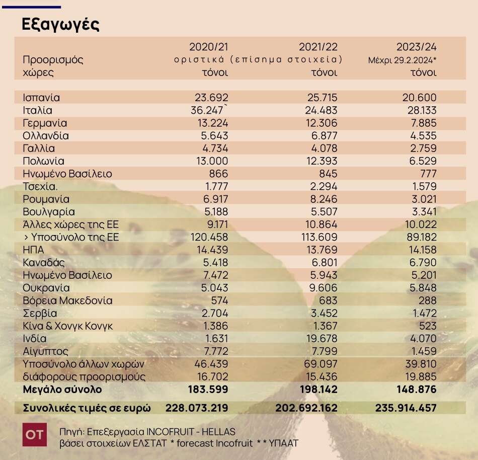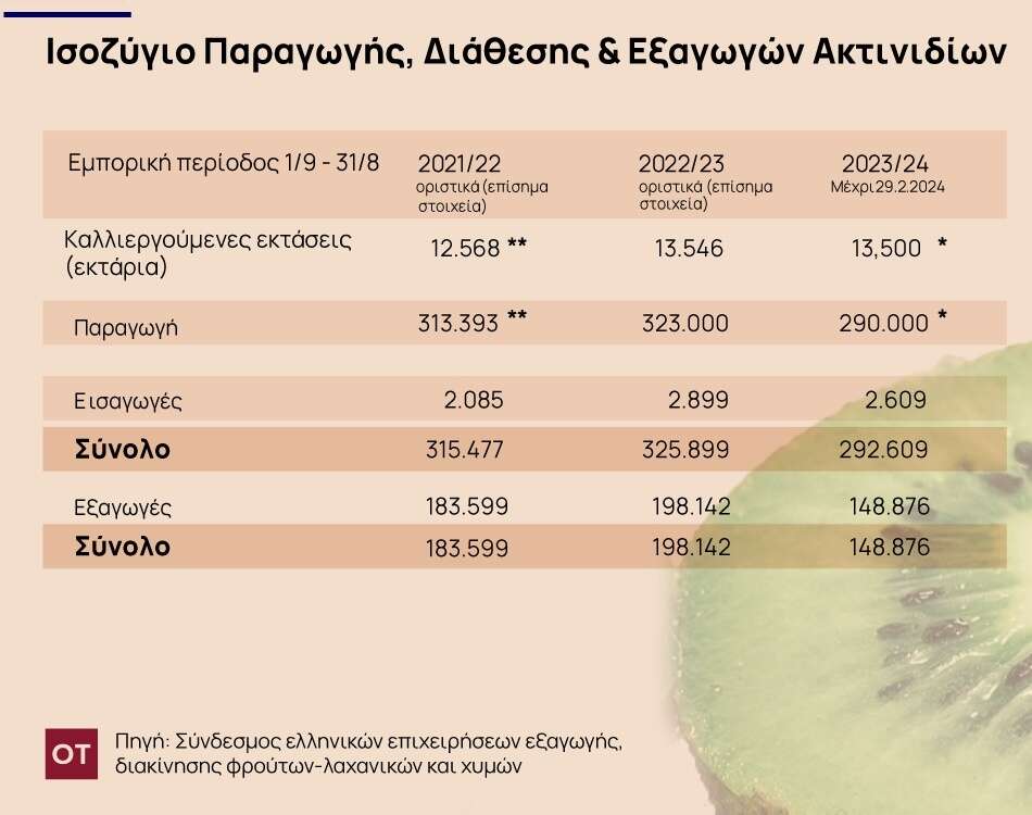 Ιδιαίτερο ενδιαφέρον παρουσιάζει και η αύξηση των εξαγωγών ακτινιδίων της χώρας μας, καθώς τα τελευταία 15 χρόνια από 38.000 τόνους το 2007/08 έφτασε τους 198.142 τόνους την εμπορική περίοδο 2022/23, καταγράφοντας ρεκόρ σε τονάζ με την αξία να διαμορφώνεται σε 202.692.162 ευρώ με μείωση κατά -17,7% της μεσοσταθμικής τιμής μονάδος έναντι της αντίστοιχης προηγούμενης περιόδου.